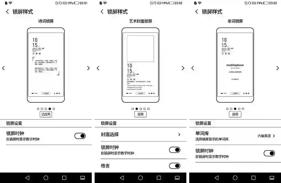 因为墨水屏不刷新时并不耗电,所以不需要息屏,因此 A5 做了一些有趣的锁屏功能,不光有诗词锁屏,单词锁屏可以帮你随时随地提升自己的文化修养,还有专门治愈现代人焦虑的鸡汤锁屏,在艺术封面的下面会显示中英双语的格言,让我感受到了来自家电厂商的正能量。