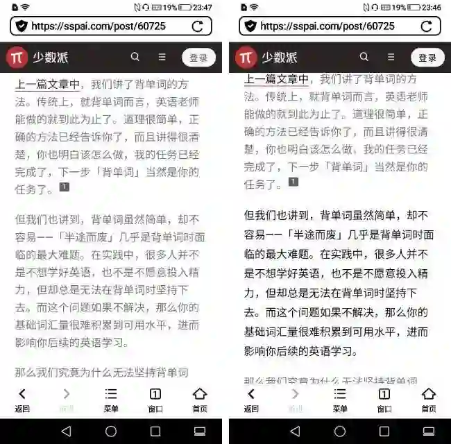 自带的 Eink 浏览器有一个高对比模式,可以将各种网页的字体针对墨水屏进行一定程度的优化。比如下面的网页,右边是开启高对比模式的截图,正文字体被调整成了黑色,在墨水屏上会看的更清楚。