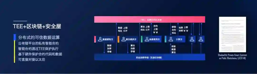 在TIC 2018大会的区块链专场中,上海交通大学副教授夏虞斌也进一步阐述了安全屋与区块链之间的关系。夏虞斌表示,“我们希望把可信的部分降低到只有我们设计的硬件才是安全可信的。”通过各种设施或机制与区块链技术进行结合,形成可信数据流通平台,保证数据强安全性。在平台搭建的基础上再搭建一个执行环境,通过TEE技术,把整个可扩展的计算包括在一个安全可靠的环境,使得明文不会外泄,从而实现数据信任。