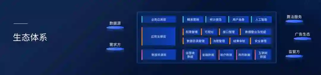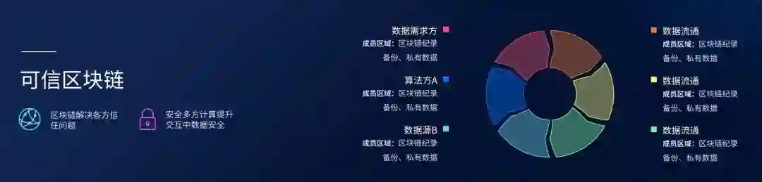 “利用可信区块链把整个环节连接起来,实现了数据融合,并保证了数据、算法、结果三者的安全性,相比传统的数据汇聚方式,可信区块链实现了完全的分布式方式来进行整个数据生态的打造,因为数据源不需要把数据上链或者上云,可以放在自己的机房,在需求方、算法方、投放方、监管方等整个生态打通的条件下,能通过安全多方计算实现对数据源、算法和结果的有效安全控制。“陈晓建说。