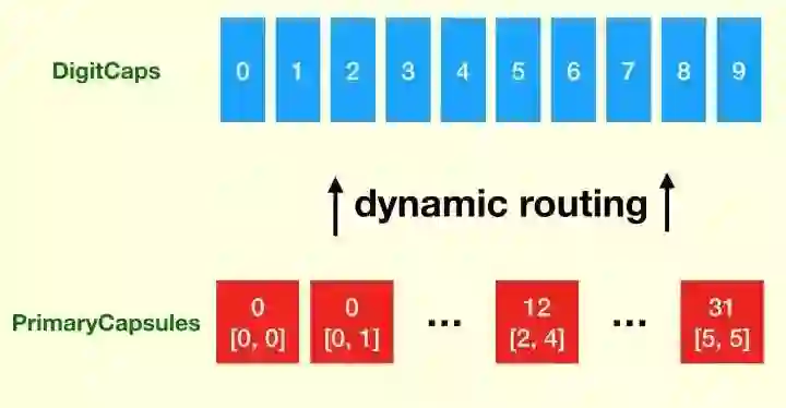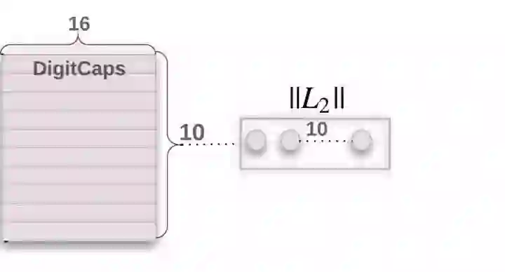 第三层,也是输出层,就是一组 10 个标准的 Capsules,每个 capsule 代表一个数字。每个 capsules 输出向量的元素个数为 16。这组 Capsules 被称为 DigitCaps (取名逼死强迫症)。