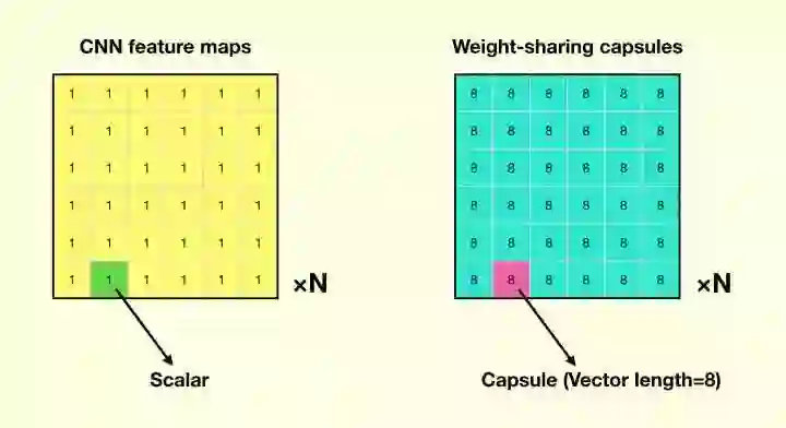 我们可以看到它们的相似点在于,每个” 平面 “内,变量都是共享权值的;而在不同” 平面 “内,变量是独立的。而不同点在于,在” 平面 “内 CNN 的单位是标量,而 Capsules 是一个 capsule 表征的向量。