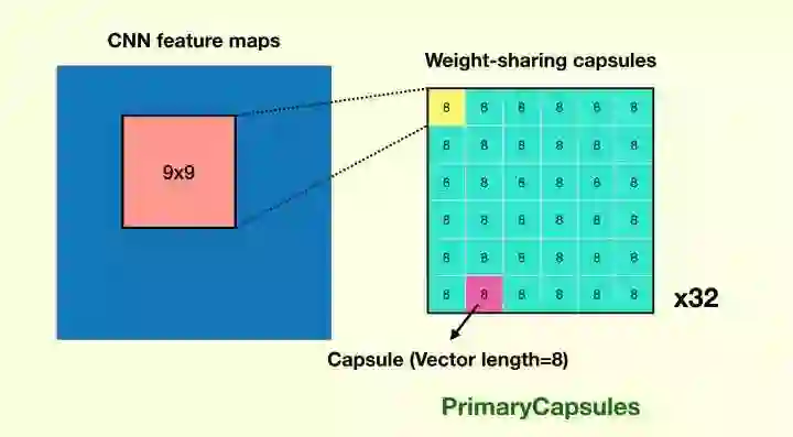 由于 CNN 共享权值的特点,这一层每个 CNN 输出的 feature map 中的 36 个 capsules 是共享权值的(通过 CNN)。显然所有的 Capsules 都共享权值是有问题的,这也是为什么这层搞 32 个 CNN 的道理:不同的 CNN 输出的 Capsules 间是独立的。