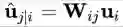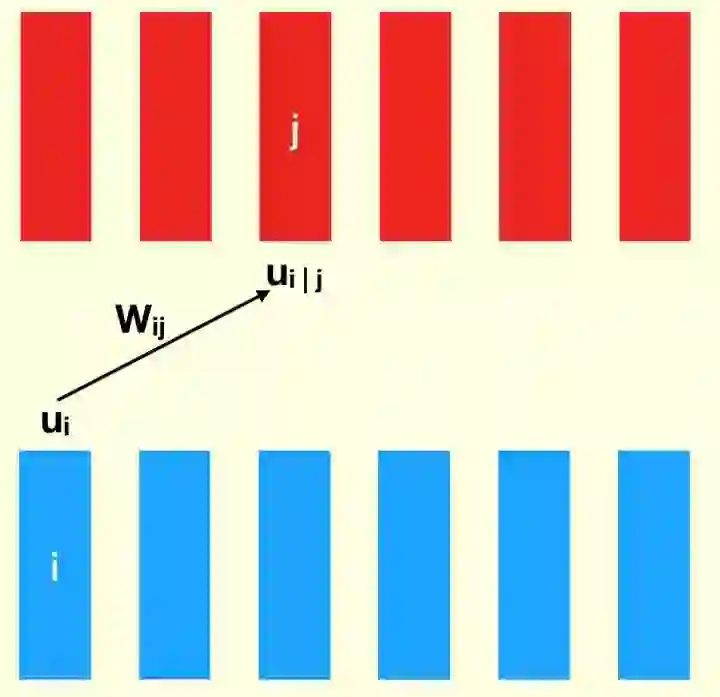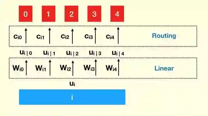 (其中 u 是下层的向量,由前层的标号为 i 的 capsule 产生,带帽子的 u 是处理后的结果,送给后层的标号为 j 的 capsule)。