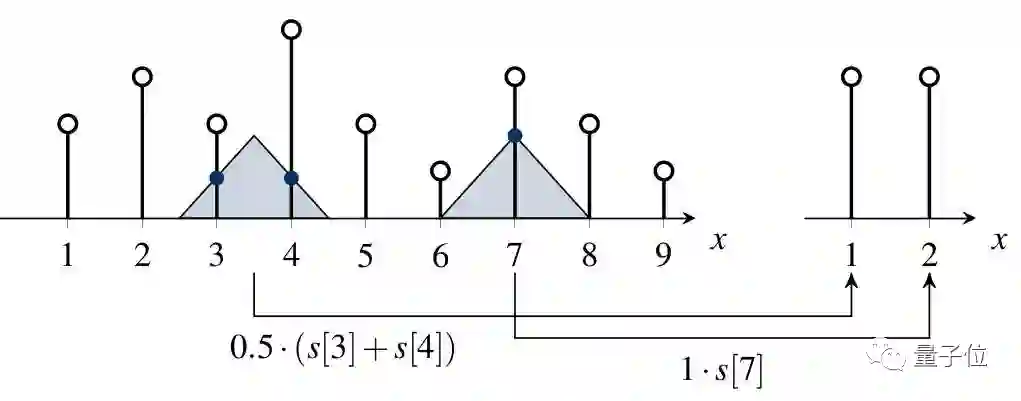 压缩图的像素是这样算出来的:滤波器窗口在图片源信号s上移动,将窗口中的每个像素值(图中圆圈)乘以该位置窗口上的权重,得到缩略后的点值。