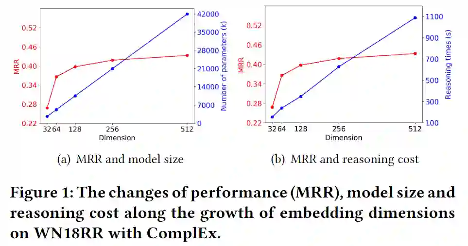 但是模型大小(参数的数量)以及推理时间的成本通常随embedding维度的增加而快速增加,如图1所示:随着embedding维度的增大,性能增益越来越小,而模型大小和推理成本却仍几乎保持线性增长。此外,高维KGE在许多现实场景中是不切实际的,尤其是对于计算资源有限或者是在推理时间有限的应用中,低维的KGE是必不可少的。然而,直接训练一个小尺寸KGE通常表现不佳,我们进一步提出一个新的研究问题:是否有可能从预训练的高维KGE中获得低维KGE,在更快成本更低的情况下取得良好的效果。