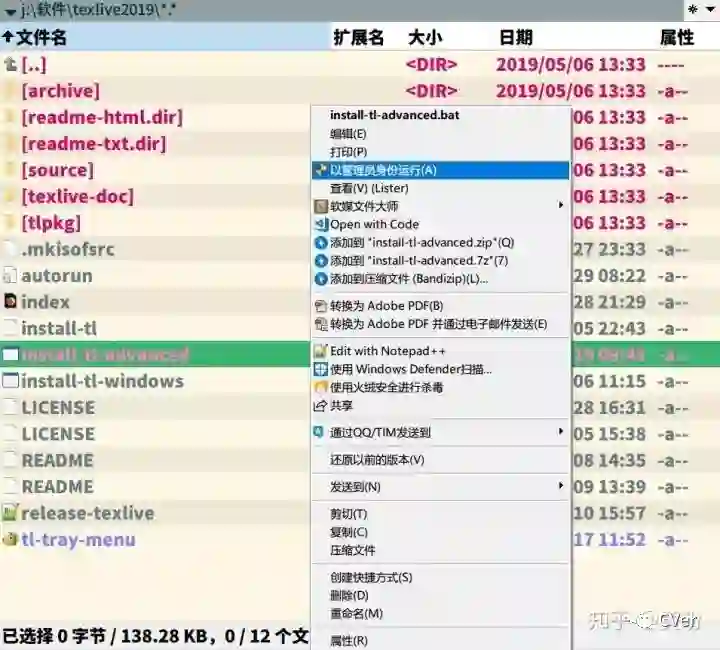 在解压出来的主目录中找到 install-tl-advanced.bat 文件,右击并以管理员身份运行。注意:文件夹路径里面不能有中文,不然打不开。