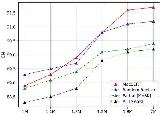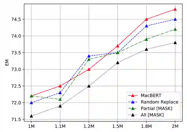 实验结果如下图所示。可以看到依赖于替换成[MASK]的实验设置(例如部分MASK和全部MASK)下效果相对较差,说明“预训练-精调”不一致的确会为下游任务带来一定的性能下降。而简单地将所有待掩码的词替换为随机词后,其性能显著优于依赖[MASK]的MLM方法。最后,我们使用相似词进行进一步优化后,其性能还会得到显著提升,说明MacBERT设计是有效的。