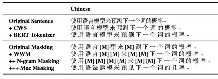 BERT-wwm:我们在谷歌原版中文BERT-base[1]的基础上,将全词掩码技术(Whole Word Masking,wwm)应用在中文环境,即在掩码语言模型(Masked Language Model,MLM)中使用词粒度进行掩码。我们使用了LTP[2]作为中文分词工具。需要注意的是,虽然掩码粒度为词,但模型的输入仍然以字为粒度(使用WordPiece分词)进行切分,即与原版BERT并无差别。