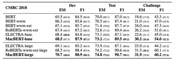 在本文中,我们回顾了经典预训练语言模型在中文场景下的性能表现,以验证这些模型在非英文语种上的通用性。同时我们提出了一种基于文本纠错的预训练语言模型MacBERT,解决了预训练模型中的“预训练-精调”不一致的问题。大量实验结果表明所提出的MacBERT能够在多数任务上带来显著性能提升。我们已将所有与本文相关的中文预训练语言模型开源,并希望能够进一步促进中文信息处理的研究与发展。基于我们在文章最后的分析讨论,未来我们将探索一种有效调整掩码比例的方法以取代手工设置的方案,从而进一步提升预训练语言模型的性能表现。