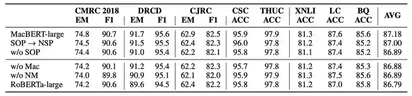 为了进一步了解性能提升的来源,我们对MacBERT-large进行了消融实验。可以看到,整个模型中最重要的部分是纠错型掩码语言模型(Mac)和N-gram掩码语言模型(NM),而相对来说模型使用NSP还是SOP预训练任务并没有对模型性能造成很大影响,因此后续工作应进一步将重点放在掩码语言模型及其变种模型的设计上。
