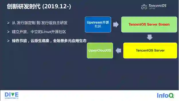 十年操作系统自主运营经验,让我们对 OS 产品研发有了更深厚的底气,有了更扎实的技术基础,这十年我把它叫做自主运营时代。2019 年,我们对外开源了我们的操作系统产品。2021 年,我们角色进行了一个大的转变,之前是发行版定制,现在变成了发行版自主研发。发行版自主研发肯定是 OS 研发人员一直以来的梦想,我们不再基于开源的 Linux 发行版,而是基于 Upstream 开源社区,或者我们自研从头开始构建操作系统发行版 TencentOS Server Stream,基于这个版本再去研发商业版本 TencentOS Server,研发社区版本 OpenCloudOS,OpenCloudOS 社区是我们发起的一个开放中立的 Linux 开源社区,我们希望通过建立这样一个开放平台,能够联合公司内外的开发者,最终把我们这个操作系统共同打造成一个绿色节能的操作系统,能够充当云原生的底座、基石,共建全场景、多元应用生态。