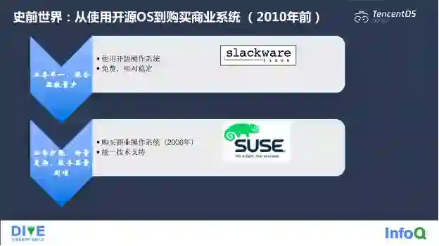 在腾讯发展初期,公司业务比较单一,服务器数量比较少,操作系统很多潜在缺陷基本上不会爆发,因此,我们就选择了开源操作系统,可以满足当时的需求,并且不需要花费额外的成本,所以公司当时就选择了 slackware 作为服务器操作系统。