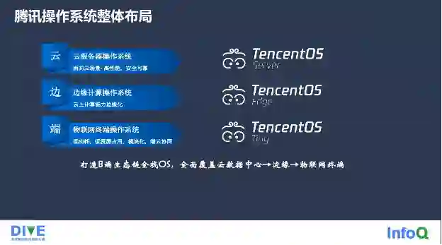 互联网的下半场是属于产业互联网,也就是说要实现人和设备、设备和设备、设备和服务之间的连接,作为整个公司业务的基石和服务器的灵魂,我们的操作系统也完成了新一轮的变革,从单一的服务器操作系统,拓展到覆盖云数据中心、边缘、物联网终端,提供基于业务场景化的全栈 OS 布局。TencentOS Server 是服务器操作系统,面向云数据中心,主要特点是高性能、安全可靠;TencentOS Edge 是边缘计算操作系统,能够将云上的计算能力边缘化;TencentOS Tiny 是物联网终端操作系统,它的特点是小而精,比如低功耗、低资源占用、模块化。我们通过这样一套操作系统布局,希望能够打造我 2B 端的生态链全栈 OS,能够全面覆盖云数据中心、边缘物联网终端,实现产业互联网的操作系统布局。
