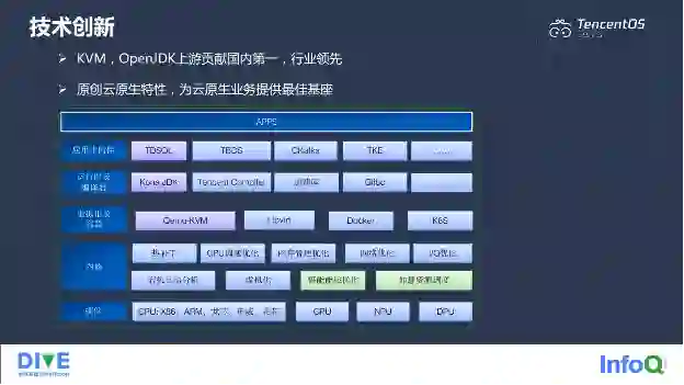 在技术创新方面,我们也做了很多。这张图是整个操作系统的框架图。内核一方面是要去适配更多的硬件,比如 CPU、GPU、NPU、DPU,另外我们也做了很多方面的优化,比如 CPU 调度优化、内存管理优化、网络优化、I/O 优化,还有云原生优化。我们还开发了宕机自动分析、热补丁功能、虚拟化。在虚拟化容器方面,我们做了很多原创的云原生特性和优化,在运行时和编译器方向,我们有 Kona JDK、Tencent Compiler 加速库。在应用中间件方面,腾讯有非常多的应用,比如 TDSQL、TBDS、CKafka、TKE。