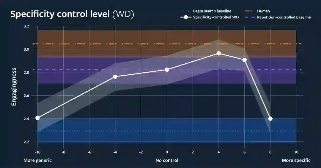 生成式对话模型经常默认使用通用的、安全的响应,比如 “I don't know”。在与斯坦福大学人工智能研究员 Abigail See 的合作中,我们研究了如何通过控制一些会话来解决这个问题,比如特异性水平。当人们参与一个交谈时,我们发现他们明显更喜欢更具体的回应,而不是一般的回应。人类注释者对我们的特异性控制模型是这样评价的:在迷人方面,我们的模型比基线模型要高 28%,在人情味方面则要高出 32%。多样性是交谈的“调味品”。