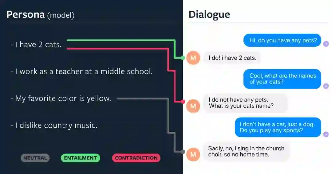 开发有人情味的聊天机器人的第一步是确保它们能够在没有失误的情况下(如前后矛盾之类)做出适当的响应。前后矛盾、不一致是聊天机器人 常见的问题,部分原因是大多数模型既缺乏明确的长期记忆,也缺乏语义理解。例如,在下面的例子中,模型说, “I have 2 cats”,但又说, “I do not have any pets.”