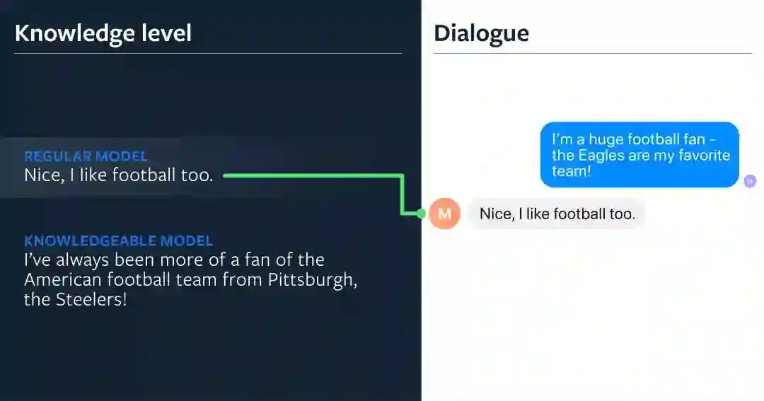 最近,我们已经提高了对话式模型 展示知识的能力,方法是通过从 Wikipedia 收集直接基于知识的对话的数据集,并创建新的模型架构来检索知识、读取知识,并在此基础上设置它们的响应条件。