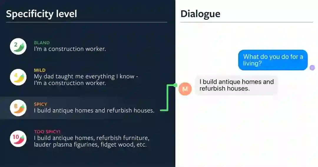 但是,过于具体的模型可能会导致过于狭隘的专注和 “驴唇不对马嘴” 的对话伙伴。在一项实验中,我们根据角色信息对机器人进行了条件设置,并询问它:“What do you do for a living?” 典型的聊天机器人会用通用语句 “I'm a construction worker.” 作为回应。通过控制方法,我们的聊天机器人提出了更具体、更有吸引力的响应,如 “I build antique homes and refurbish houses.”。