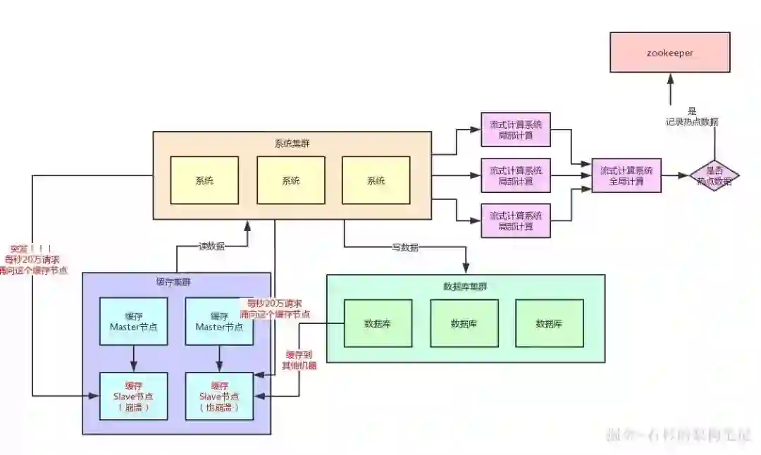 你自己就该限制好,每个系统实例每秒最多请求缓存集群读操作不超过 400 次,一超过就可以熔断掉,不让请求缓存集群,直接返回一个空白信息,然后用户稍后会自行再次重新刷新页面之类的。