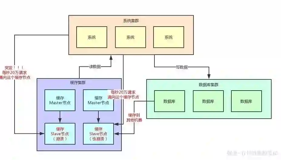 但是接踵而来的每秒 20 万请求,会再次压垮其他的缓存机器。以此类推,最终导致缓存集群全盘崩溃,引发系统整体宕机。