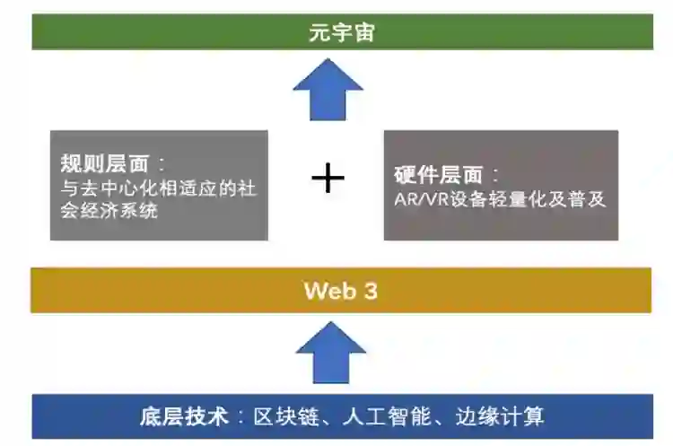 要想真正实现实现元宇宙,需要遵循这样一个逻辑关系:先有分布式数据库、加密技术、边缘计算等底层技术的成熟,才有Web 3时代的到来,再在此基础上结合VR/AR等硬件设备和与之相适应的政策监管环境,环环相扣、层层递进,才会最终形成理想状态下的元宇宙。