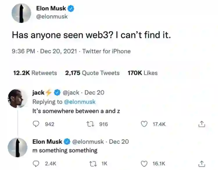 Jack Dorsey和马斯克在Twitter上关于Web 3的调侃