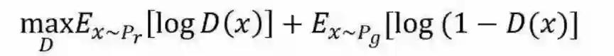 上述这种博弈式的训练过程,如果采用神经网络作为模型类型,则被称为生成式对抗网络(GAN)。用数学语言描述整个博弈过程的话,就是:假设我们的生成模型是g(z),其中z是一个随机噪声,而g将这个随机噪声转化为数据类型x,仍拿图片问题举例,这里g的输出就是一张图片。D是一个判别模型,对任何输入x,D(x)的输出是0-1范围内的一个实数,用来判断这个图片是一个真实图片的概率是多大。令Pr和Pg分别代表真实图像的分布与生成图像的分布,我们判别模型的目标函数如下: