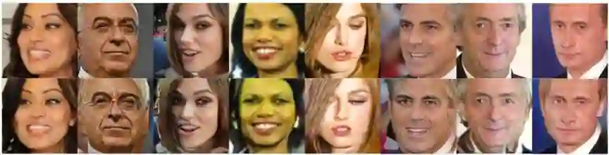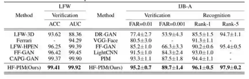 上图在IJBA数据库上的可视化结果,第一行为输入图像,第二行为通过HF-PIM模型进行人脸正面化后的结果。