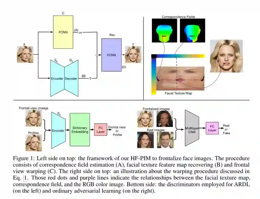 在该论文中,作者分析总结了先前人脸转正工作中存在的一些限制,例如,过于依赖低维信息约束,不能很好地保持原图的语义信息,模型生成的图像的分辨率有限等。为了解决这些问题,作者提出了高保真度的姿态不变模型(High Fidelity Pose Invariant Model,HF-PIM)来克服上述问题。具体做法总结如下:1、引入了一种能反映三维人脸模型和二维的人脸图像之间点到点的关联稠密关联场,让提出的网络能够在二维图像的指导下学习到隐含的三维人脸信息。2、设计了一种全新的纹理扭曲(warping)过程,可以有效地把人脸纹理映射到图像域,同时有可以最大程度地保持输入的语义信息。3、提出了一种对抗残差字典学习过程,从而可以在不依赖三维数据的情况下更有效地学习人脸纹理特征。网络的结构图如下所示: