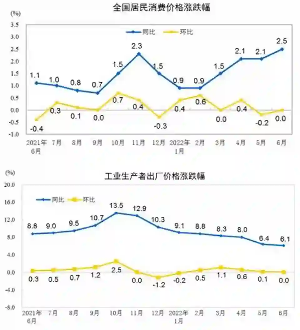【6月份CPI、PPI环比持平,同比继续上涨】国家统计局发布的数据显示,中国6月份居民消费价格(CPI)同比上涨2.5%,也是自2020年8月以来近两年中的新高,环比持平。6月份工业生产者出厂价格(PPI)同比上涨6.1%,环比持平。(每日经济新闻)