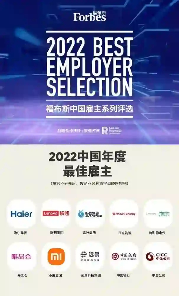 【2022福布斯中国最佳雇主榜单发布,蚂蚁、小米等上榜】福布斯中国联合罗盛咨询公司正式发布“2022中国年度最佳雇主”评选结果,蚂蚁集团、海尔集团、小米集团等10家企业入选。该评选历时3个月,超过7万人参与,以企业及员工调研、企业资质审核、专家评审团评选等多维度进行。(新快报)