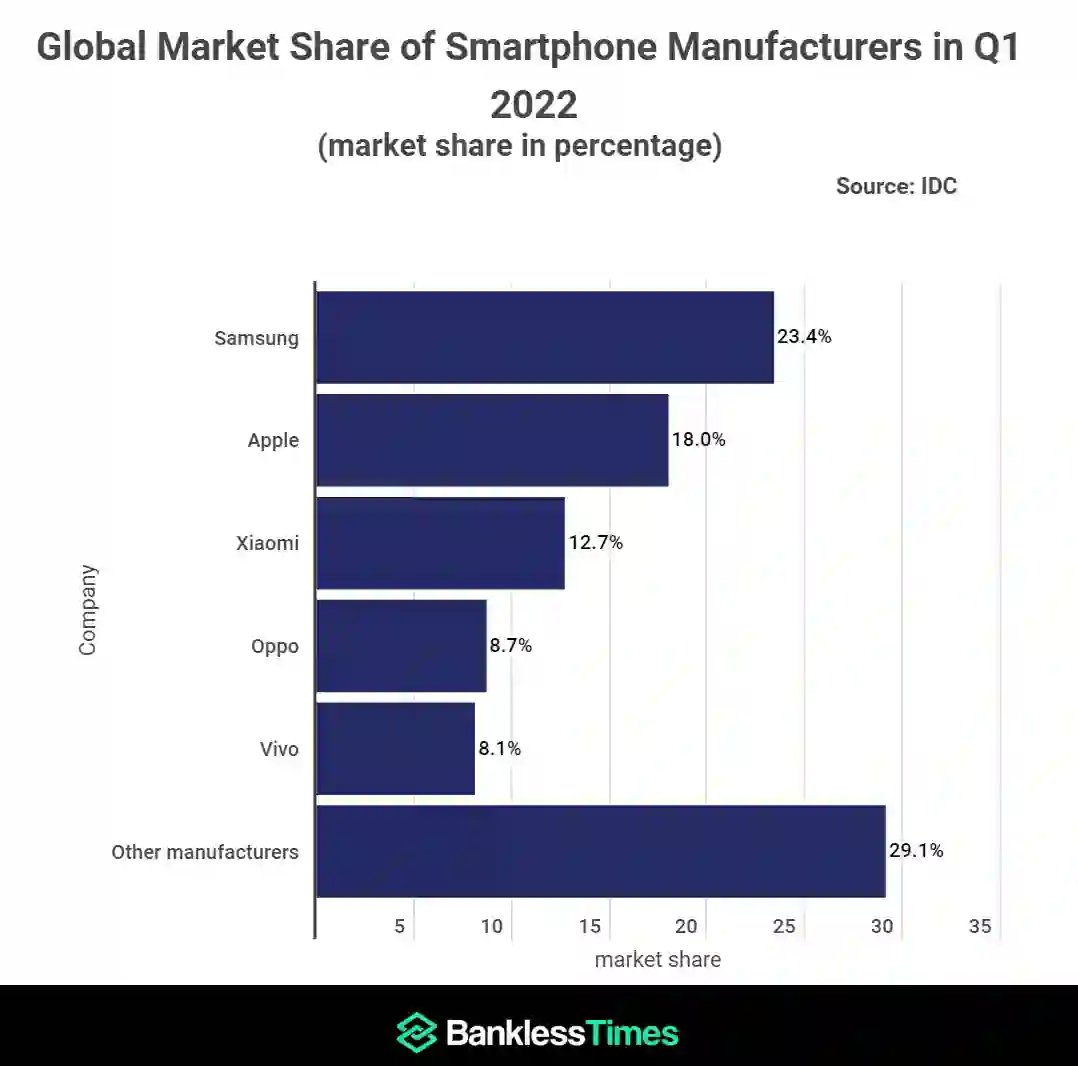 【机构:小米、OPPO、vivo智能手机一季度出货量进前五】据《Bankless Times》一项报告,三星电子第一季度供应了7360万部智能手机,全球市场占有率达到了23.4%;第二名的苹果的全球出货量为5600万台,市占率18%;小米以12.7%的市场份额位居第三,OPPO市占率8.7%列第四,vivo以8.1%位居第五。(新浪科技)
