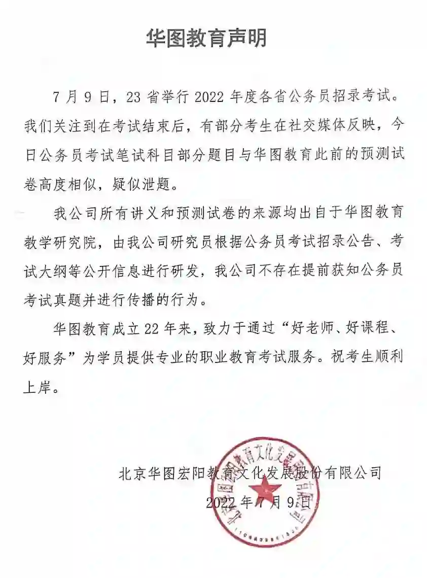 【华图教育回应公务员考试疑似泄题】公务员招录考试结束后,有部分考生反映,笔试科目部分题目与华图教育此前的预测试卷高度相似,疑似泄题。华图教育发布声明,公司所有讲义和预测试卷,均出自于华图教育教学研究院,是根据公开信息进行研发,不存在提前获知公务员考试真题并进行传播的行为。(环球网)