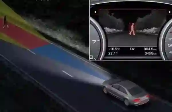 汽车夜视系统,利用红外线技术能将黑暗变得如同白昼,使驾驶员在黑夜里看得更远更清楚。夜视系统的结构由 2 部分组成:一部分是红外线摄像机,另一部分是挡风玻璃上的光显示系统。