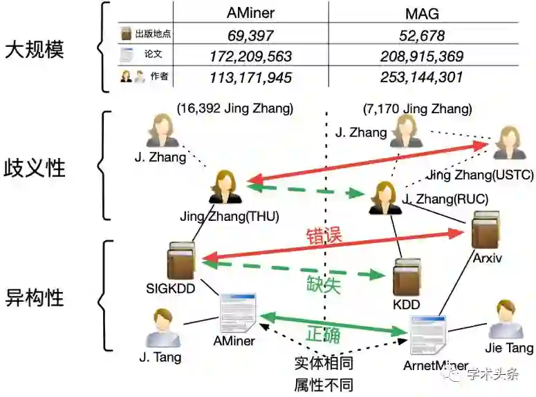 构建亿级开放学术图谱是一项极具挑战的研究工作。下面举例说明主要的难点所在: