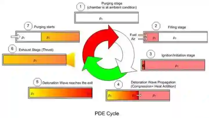 因为PDE是以脉冲间歇形式工作的,工作频率受限(理论上不超过200Hz)。这是因为即使爆震燃烧速率非常高(消耗时间甚至<1ms),但控制头部喷注的旋转阀的旋转速率有极限,在每个周期内燃料喷注、混合、着火、排气等过程均需要一定时间。此外,每个周期内都需要经历点火和爆燃向爆震转变的过程,所以对点火系统要求较高。如果出现点火失效的情况,可能会造成严重后果,这也是有的学者不看好脉冲爆震的一个原因之一(不代表作者观点)。