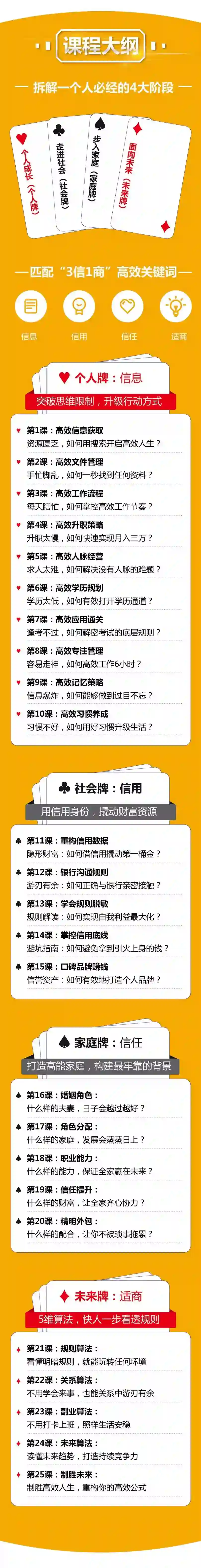 课程里,朱丹老师把个人人生必经阶段拆解成四大维度,组成四张高效牌: