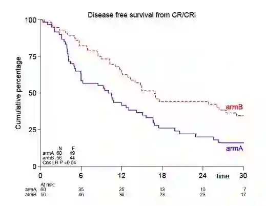 研究数据表明阿扎胞苷用于这类患者的维持治疗是可行的。随机化时对诊断时低风险细胞遗传学异常和血小板计数调整后,阿扎胞苷维持治疗组的DFS明显更好(作为CR与CRi的替代指标; Cox回归;HR=0.62; 95%CI,0.41~0.95; P = 0.026)。阿扎胞苷组的12个月DFS估计为64%,对照组为42%(P = 0.04);24个月和36个月DFS估计为44% vs 20%和32% vs 16%。