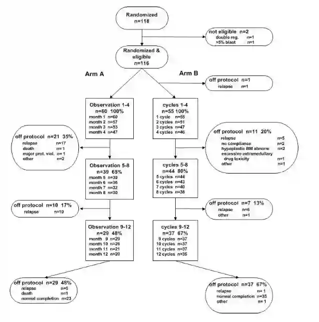 该研究最终纳入116例符合条件的患者,并将其随机(按照1:1)分配至观察组(n = 60)或阿扎胞苷维持治疗组(n = 56; 50 mg / m2,皮下注射5天,每4周1次)直至复发,最多12个周期。55例患者接受了至少1个周期的阿扎胞苷治疗,46例患者接受了至少4个周期的阿扎胞苷治疗,35例患者接受了至少12个周期的阿扎胞苷治疗。