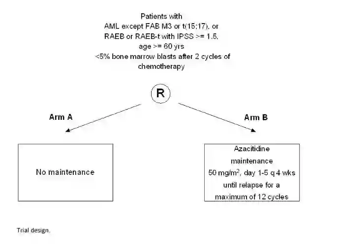 该随机3期研究(HOVON97)入组了年龄不小于60岁的急性髓系白血病或伴顽固性贫血、原始细胞过多的骨髓增生异常综合征(MDS)患者,并且在至少2个周期强化疗治疗后获得CR或血液学恢复不完全的CR(CRi)。研究人员评估了阿扎胞苷作为缓解后治疗在无病生存率(DFS;主要研究终点)和总生存率(OS;次要研究终点)方面的作用。