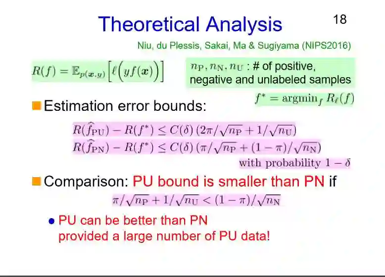在左边PU的边界可以比PN的边界要小,我们一开始是用PU的结果而没有PN的,这是我们的起点。但如果满足了这个条件,PU数据的学习要比PN数据的学习更好,但前提是我们要有大量PU数据;因为如果说有大量的PU的数据的话,我们左侧边界值就会变的小一些。所以说,PU的学习有时候可以比PN更好一些,这让我们研究出下一种方法,我后面会给大家看另外一种方法。
