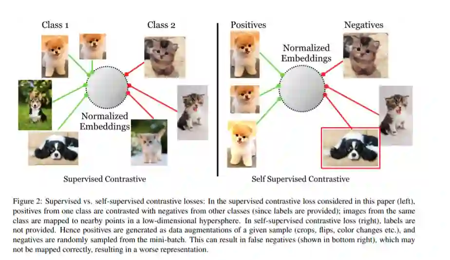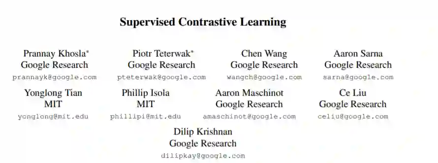 交叉熵是图像分类模型监督训练中应用最广泛的损失函数。在这篇论文中,我们提出了一种新的训练方法,在不同架构和数据扩充的监督学习任务中,它的表现始终优于交叉熵。我们修改了批量对比损失,这是最近被证明在自监督学习强大表示是非常有效的。我们能够比交叉熵更有效地利用标签信息。在嵌入空间中,将同一类的点聚在一起,同时将不同类的样本聚在一起。除此之外,我们还利用了关键的成分,如大批量和标准化嵌入,这些已经被证明有利于自监督学习。在ResNet-50和ResNet-200上,我们的交叉熵性能都超过了1%,在使用自动增广数据增强的方法中,我们设置了78.8%的最新水平。这一损失也清楚地表明,在校准和准确性方面,对标准基准的自然损坏具有鲁棒性。与交叉熵相比,我们的监督对比损失更稳定的超参数设置,如优化或数据扩充。