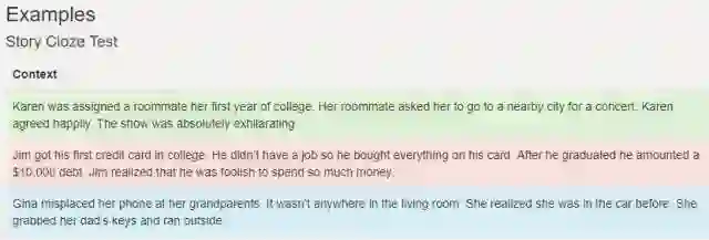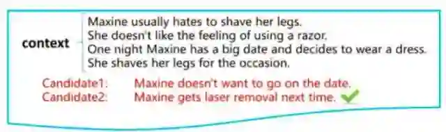 与之类似的还有ROC story cloze task,这个数据集涵盖了5W+篇短小的故事,每个故事由5句话组成。