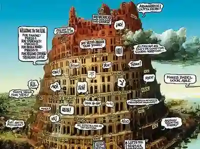 建塔的人都说着同一种语言,心意相通、齐心协力。上帝看到人类竟然敢做这种事情,就让他们的语言变得不一样。因为人们听不懂对方在讲什么,于是大家整天吵吵闹闹,无法继续建塔。后来人们把这座塔叫作巴别塔,而“巴别”的意思就是“分歧”。