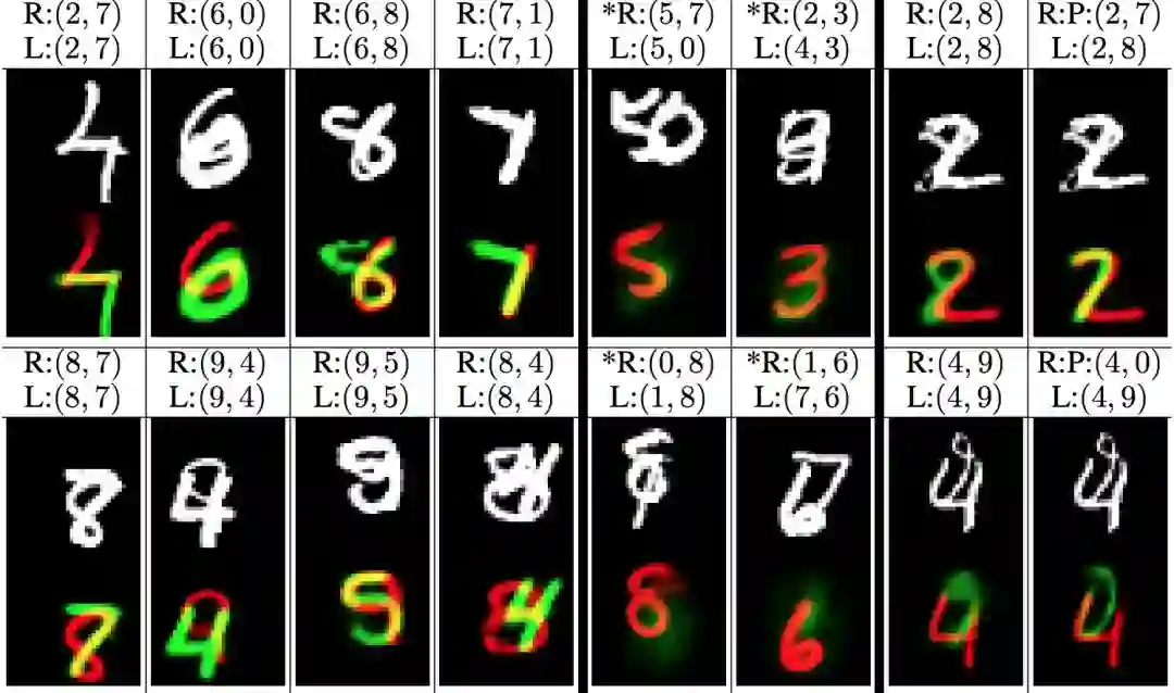 图3 MultiMNIST 图像(白色) 和CapsNets重构图像 (红色+绿色)。“R”代表重构 ,“L”代表标签. 如:这一个例子预测(左上)是正确的,重构图像也是正确的。但第5个例子预测是错的,(5,0)预测成了(5,7)。因此,5被正确重构,而0却没有。图形来自论文《Dynamic routing between capsules》, 引用得到作者许可。