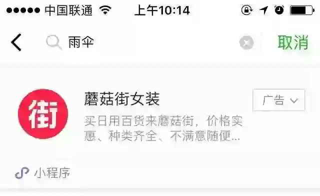 中国企业家杂志(ID:iceo-com-cn)在“搜一搜”中输入“雨伞”,结果排在第一位的是投放广告的小程序“蘑菇街女装”。不可否认的是,微信通过“搜一搜”功能,让用微信搜索的用户与相关广告商建立了一种联系。而这些广告投放的多为腾讯投资或入股的相关电商企业。
