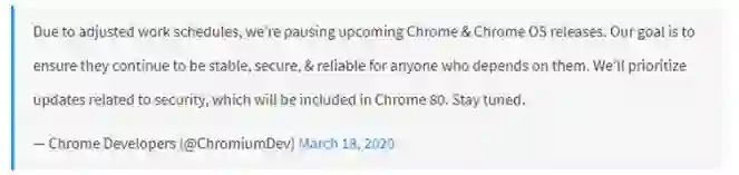 新冠肺炎疫情迫使 Google 在内的众多科技公司实施了远程办公,这显然会影响到现有的工作计划。Google Chrome 官方博客宣布,因工作计划的调整,他们暂停了 Chrome 和 Chrome OS 的发布,当前的优先目标是确保工程师们稳定、安全可靠的工作。安全更新仍然是优先任务,Google 会继续释出安全更新。