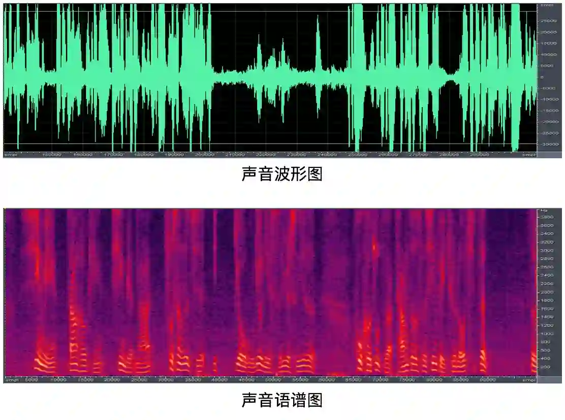 声纹不如图像那样直观展现,在实际分析中,可通过波形图和语谱图进行展现,如下所示: