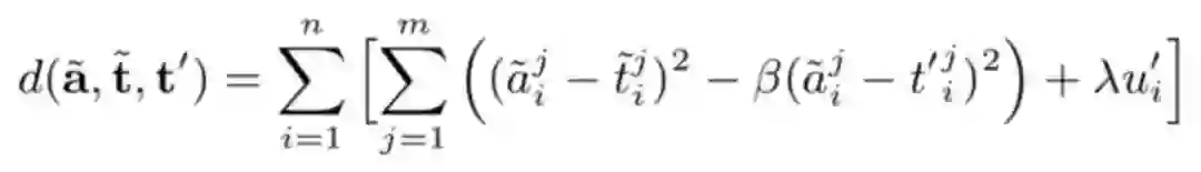 因为同一个句子中存在多个目标,而不同的目标又关联多个不同的方面,如何区分不同目标-方面之间的相互联系呢?为了解决该问题,对于每一个优化方面向量,我们不仅考虑它和对应目标之间的距离,同时也关注它和那些无关目标之间的距离,所以我们将目标函数分为了两部分: